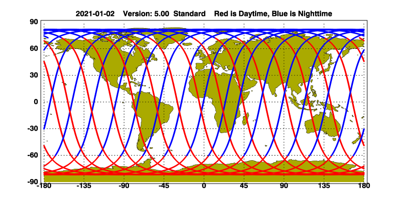 The orbit track locations for the entire Level 1 .hdf file are in black and the orbit track locations corresponding to this page are color coded.