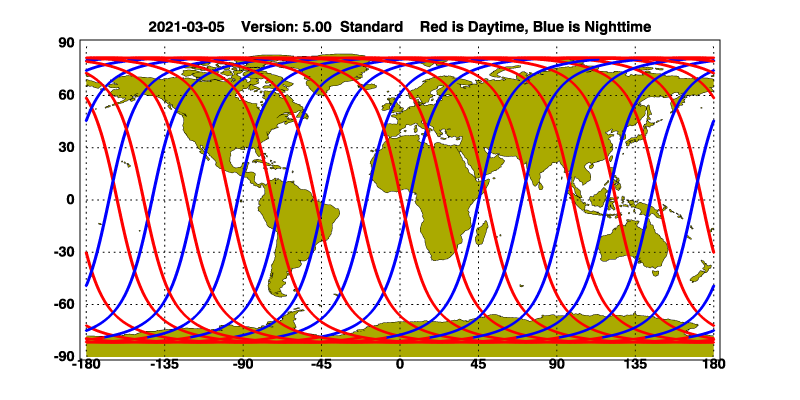 The orbit track locations for the entire Level 1 .hdf file are in black and the orbit track locations corresponding to this page are color coded.