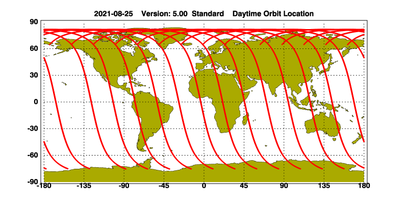 The orbit track locations for the entire Level 1 .hdf file are in black and the orbit track locations corresponding to this page are color coded.
