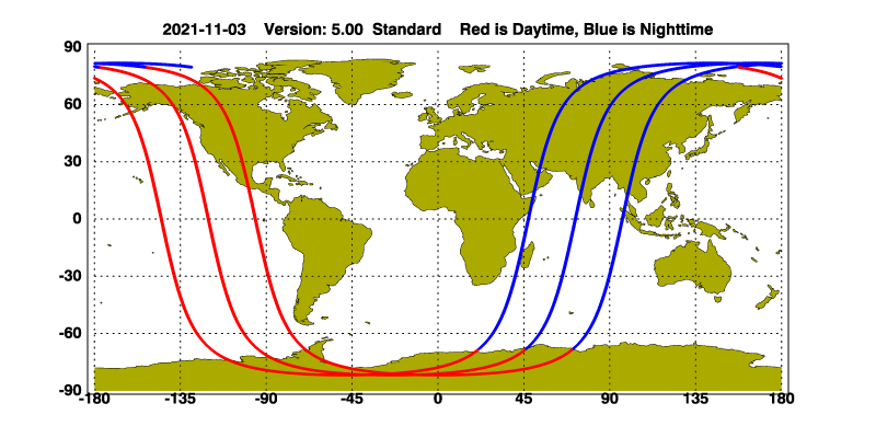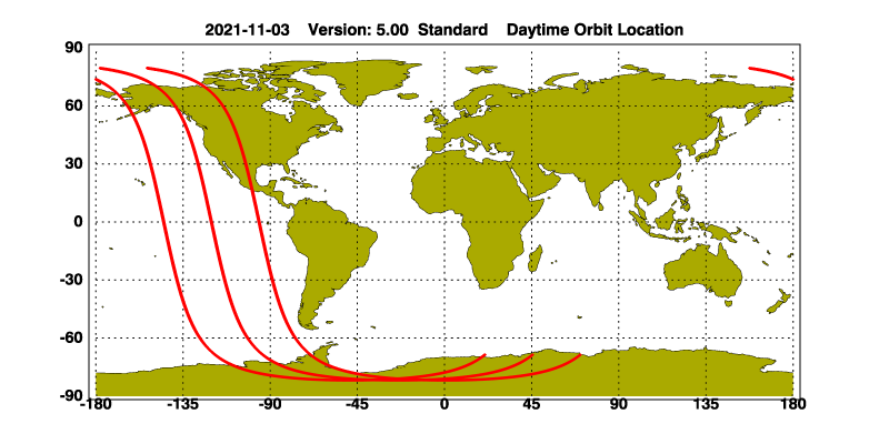 The orbit track locations for the entire Level 1 .hdf file are in black and the orbit track locations corresponding to this page are color coded.