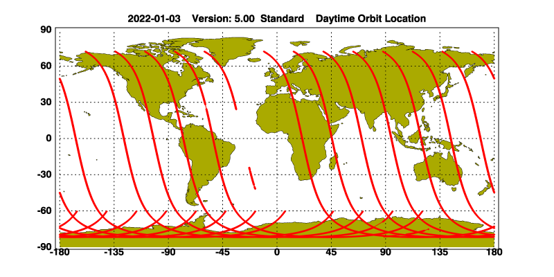 The orbit track locations for the entire Level 1 .hdf file are in black and the orbit track locations corresponding to this page are color coded.