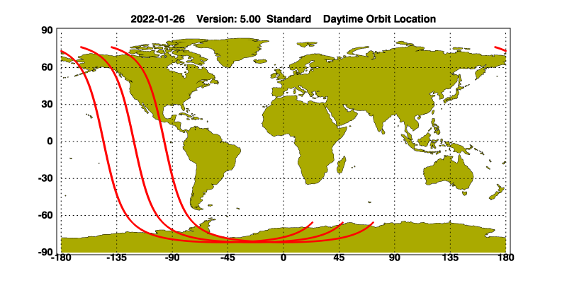 The orbit track locations for the entire Level 1 .hdf file are in black and the orbit track locations corresponding to this page are color coded.