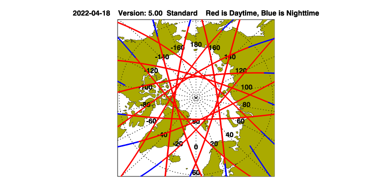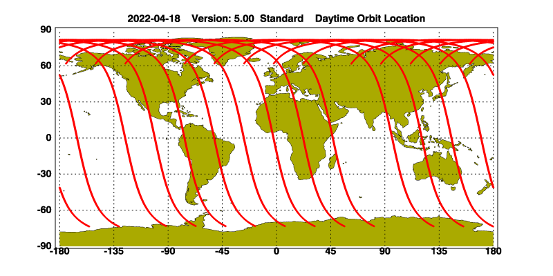The orbit track locations for the entire Level 1 .hdf file are in black and the orbit track locations corresponding to this page are color coded.
