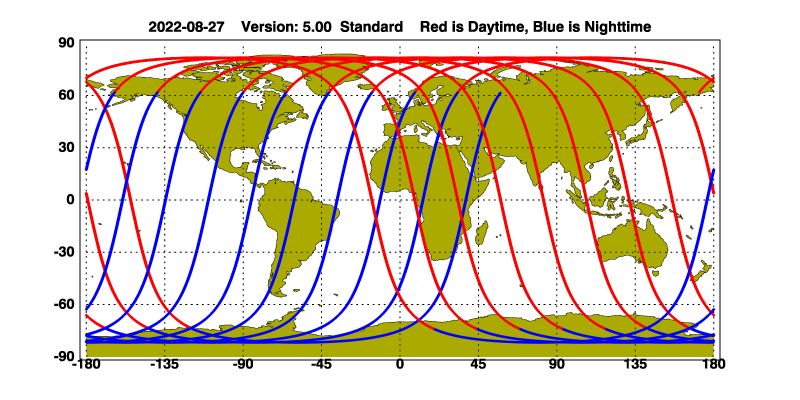 The orbit track locations for the entire Level 1 .hdf file are in black and the orbit track locations corresponding to this page are color coded.