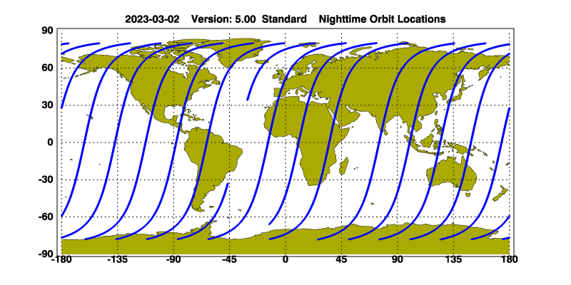 The orbit track locations for the entire Level 1 .hdf file are in black and the orbit track locations corresponding to this page are color coded.