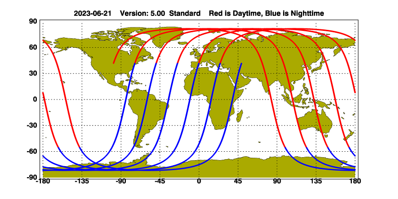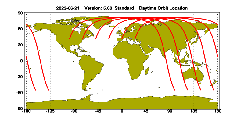 The orbit track locations for the entire Level 1 .hdf file are in black and the orbit track locations corresponding to this page are color coded.