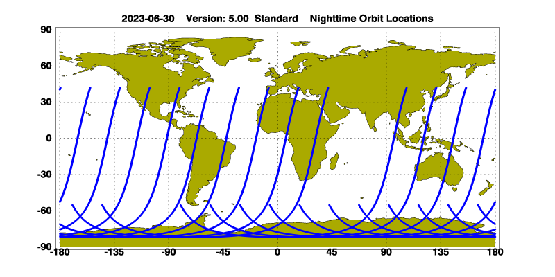 The orbit track locations for the entire Level 1 .hdf file are in black and the orbit track locations corresponding to this page are color coded.
