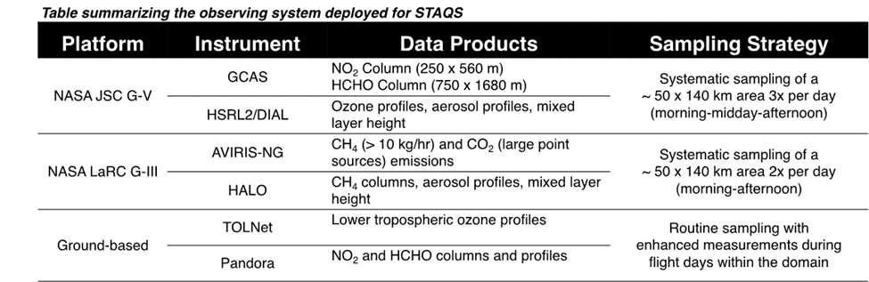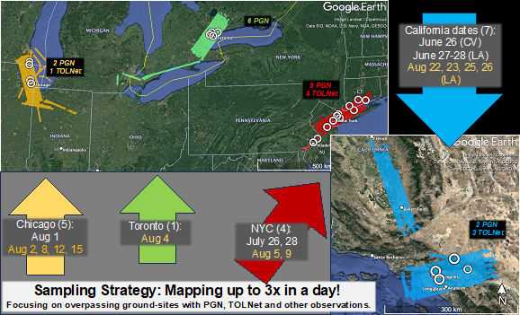 - STAQS Map including measurement areas of interest for flight and ground locations (The colored blocks on the map represent of locations mapped by NASA aircraft during STAQS with noted flight dates. White circles show ground locations for measurements (PGN and TOLNet) supported by STAQS. Dates in yellow are those that coincide with TEMPO observations.)